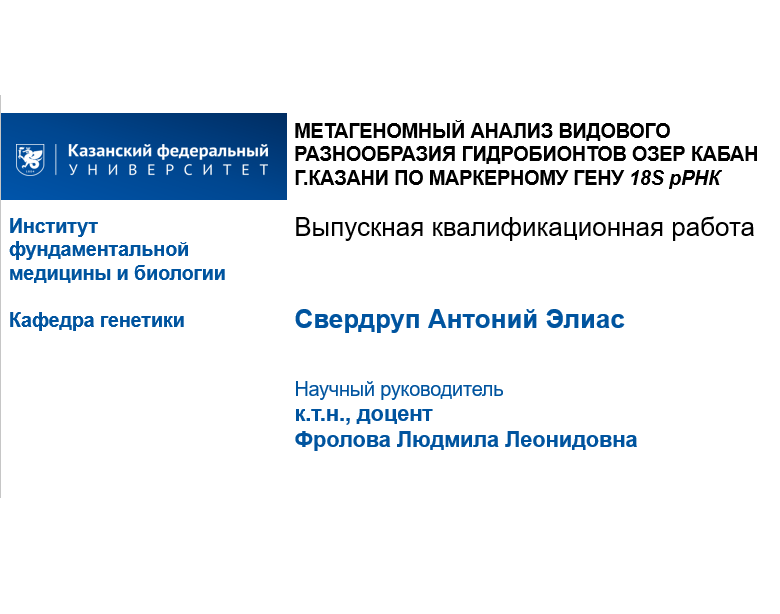 Моя искренняя благодарность председателю и членам государственной экзаменационной комиссии – проф. Поздееву Оскару Кимовичу, проф. Чернову Владиславу Моисеевичу, проф. Ильинской Ольге Николаевне, зав. каф. генетики д.б.н. Каюмову Айрату Рашитовичу, научному руководителю – к.т.н., доц. Фроловой Людмиле Леонидовне, рецензенту – к.б.н., доц. Трушину Максиму Викторовичу, д.б.н. Деревенской Ольге Юрьевне и к.б.н. Палагушкиной Ольге Викторовне за определение гидробионтов по морфологическим признакам в пробах из озер Кабан, а также к.б.н. Маланину Сергею Юрьевичу за совместную работу по пробоподготовке и секвенированию по маркерному гену 18S рРНК, всем преподавателям и сотрудникам кафедры генетики и научно-исследовательских лабораторий.