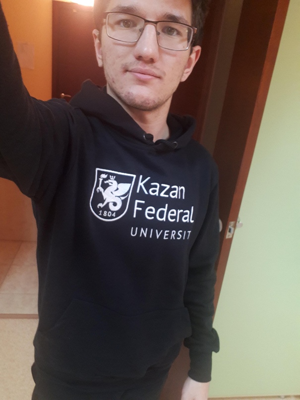 «Привет всем, я — Стойков Даниил Иванович, мне 18 лет. Я из Казани, закончил 177 Лицей. Мысль поступить в КФУ появилась далеко не сразу. В средней школе я был уверен, что пойду на психолога. После сдачи ОГЭ думал о поступлении в колледж на повара, но в итоге закончил 11 классов и на ЕГЭ решил сдать химию. Раньше занимался всем понемногу, но в итоге ничем конкретным. Из увлечений чтение, учеба. Ничего экстраординарного. Пока нет возможности выступать на мероприятиях, всё время уходит на учебу.