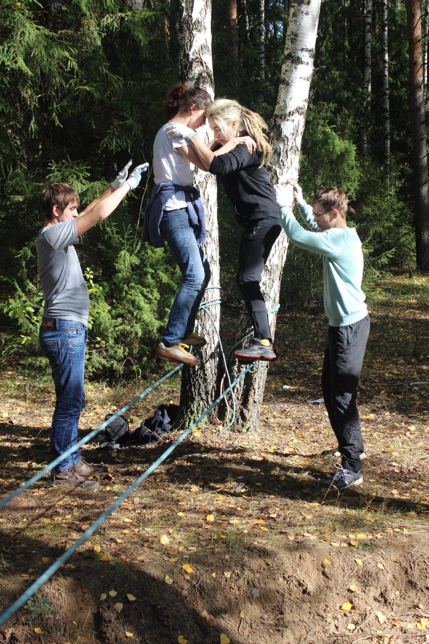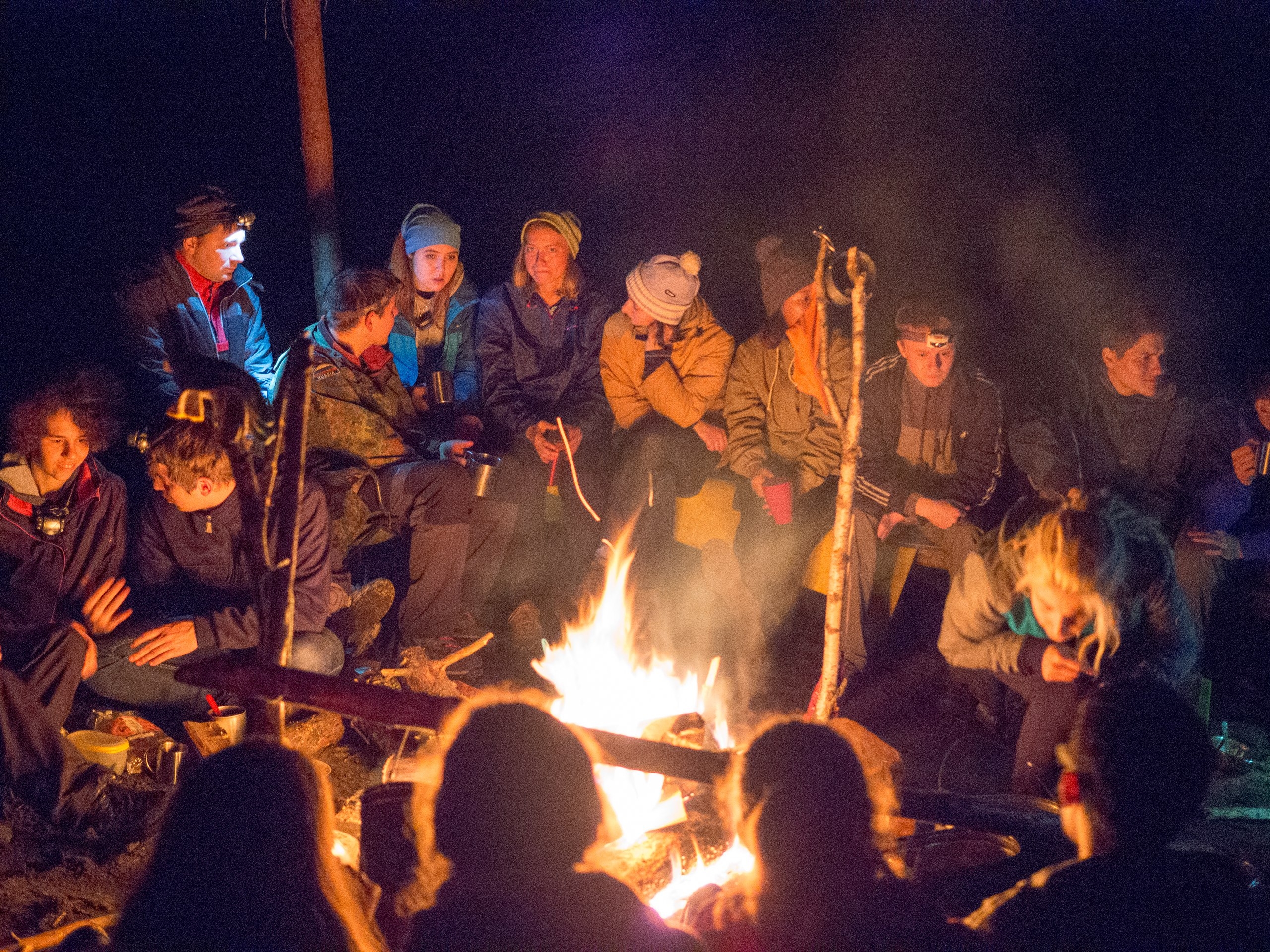 А посвящались мы вот как: электричка… Ну что может быть более романтичнее и атмосфернее? Прямо с электрички мы попали в ласковые руки природы. И 40 абсолютно непохожих людей, приехавших из самых разных уголков России (и не только) образовали дружную шеренгу и дружно шагали к месту назначения. Затем, конечно же, костёр. Вы, навярняка, представляли себе сцену из фильма — хорошая компания, песни под гитару, улыбки, закат и полное взаимопонимание с природой. Да-да, именно так всё и было. Потом, по-моему, один из самых важных этапов — приготовление пищи. В нашем меню были макароны с соусом из свежеконсервированной тушёнки, щедро приправленные дымком и отличным настроением (потому что сытый турист- счастливый турист). Ммм, я уверена, ничего вкуснее вы в жизни не пробовали! С утра, подзарядившись вкуснейшим завтраком, мы отправились познавать «aзы туризма». Нас ждал увлекательный квест требующий работы с картой, снаряжением и верёвками. Не обошлось и без креатива- задание на самое классное фото на туристическую тематику.